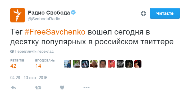 Тег #FreeSavchenko вошел в десятку популярных в российском твиттере