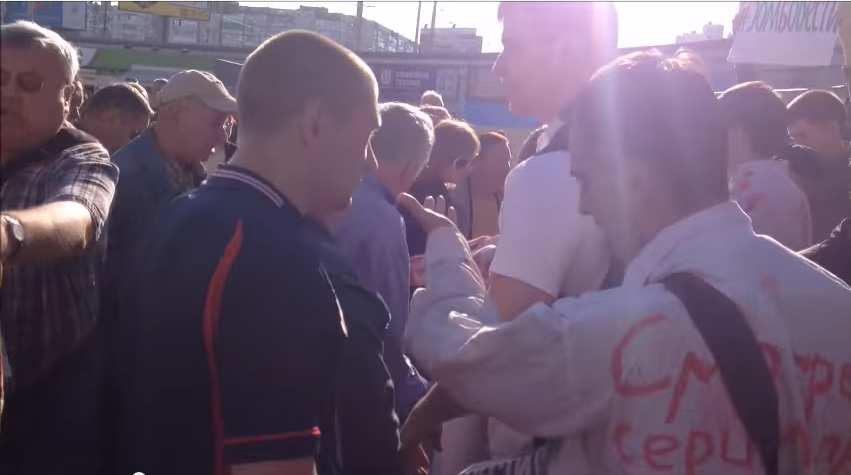 Тільки-но черга брати газету підійшла до зомбі, у натовпі з'явилась організована група молодиків спортивної статури. Вони почали грубо відштовхувати активістів, а потім бити їх. Одного із "зомбі" молодики завалили та били ногами.
