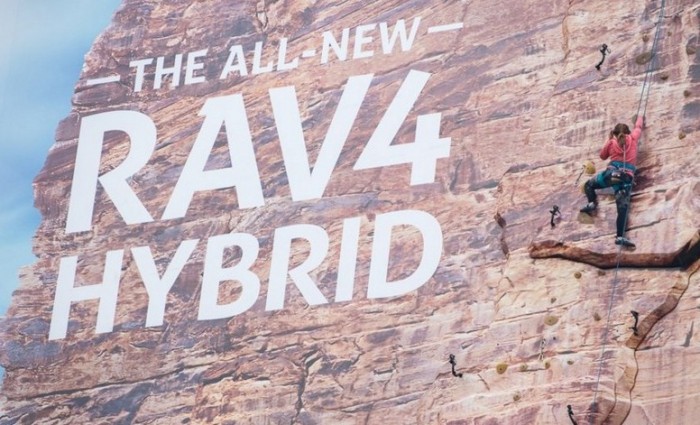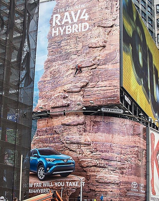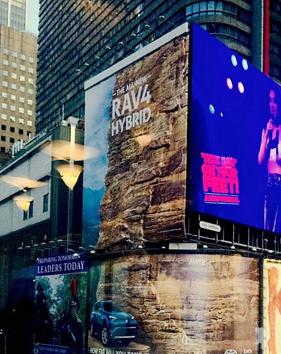 Необычная рекламная конструкция появилась в центре Нью-Йорка на Таймс-сквер и была приурочена к презентации обновлённого гибрида Toyota RAV4. Установленный билборд стал самой высокой рекламной конструкцией когда-либо размещавшейся на улицах Нью-Йорка, ее высота составила более 35 метров.