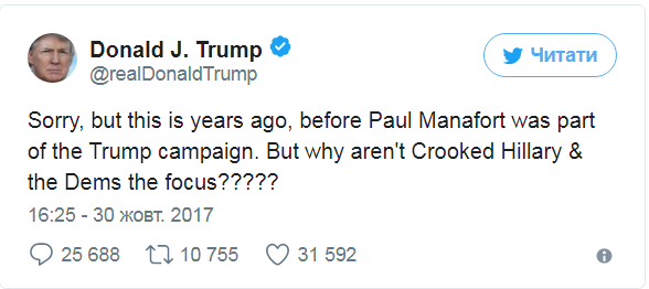 "Вибачте, але це було багато років тому, перш ніж Манафорт cтав частиною кампанії Трампа. Чому брехлива Гілларі та демократи не в центрі уваги?", - написав Трамп у своєму Twitter.