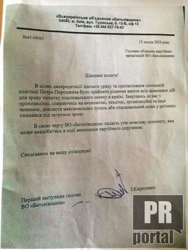 У «Батьківщині» переконують, що лист про зрив опалювального сезону є фальшивкою