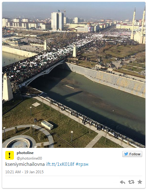 Як повідомляють у соцмережах учасники акції, весь центр Грозного заповнений людьми.