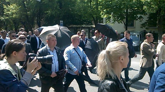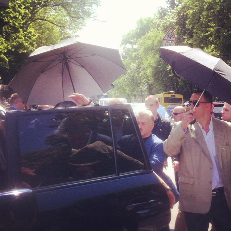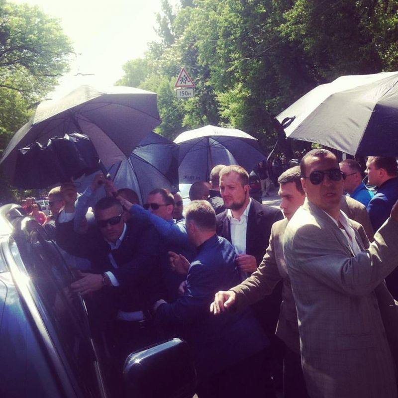 Втім, охоронці швидко розкрили чорні парасолі і захистили його від прямого влучання пляшок.