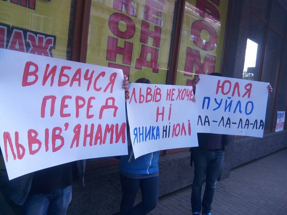 В руках активістів були плакати з написами: «Юля, за тобою плаче тюрма або Россдума», «Юля – Пуйло, ла-ла-ла», «Вибачся перед львів'янами», «Львів не хоче ні Яника, ні Юлі». Також активісти вигукували «Ганьба!».