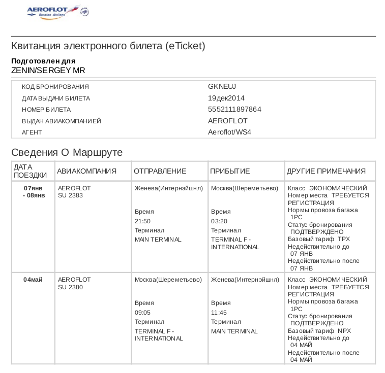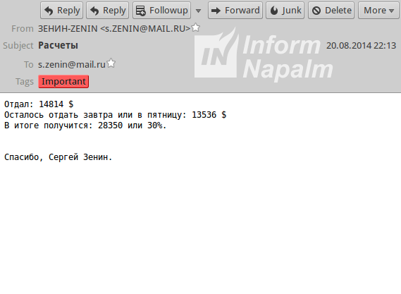 После этого в августе 2014 года Зенин вылетает в Марсель (Франция), а позже транзитом через Москву оказывается в Женеве (Швейцария). Находясь в Москве, он делает следующую заметку: "Отдал: 14814$. Осталось отдать завтра или в пятницу: 13536$. В итоге получится: 28350 или 30%".