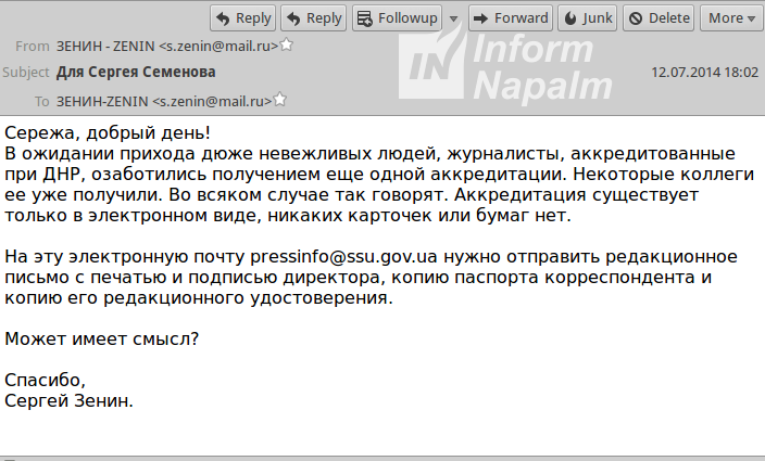 Волонтеры международного сообщества Inform Napalm опубликовали данные, полученные из взломанной почтовой переписки и облачного хранилища российского журналиста и пропагандиста государственного "Первого канала" РФ Сергея Зенина.