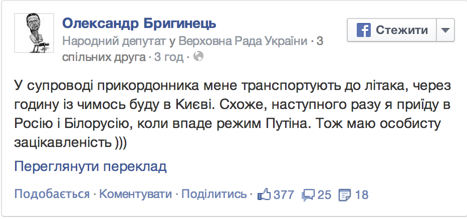 Около 8:00 по киевскому времени Бригинец на своей странице в Facebook написал, что в сопровождении пограничника его транспортируют к самолету.