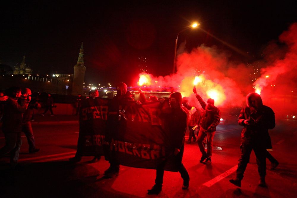 В центре Москвы активисты устроили акцию в поддержку Майдана. Они прошли по Софийской набережной и сожгли несколько файеров и флаг Новороссии. Активисты несли баннер с надписью «Вчера Киев — завтра Москва»