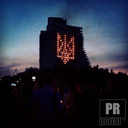 В Дніпропетровську підсвітили найбільший в Україні тризуб, який встановлений на недобудованому готелі "Парус"