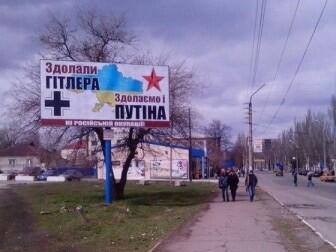 У місті Лисичанськ, Луганської області з'явився борд з написом: "Здолали Гітлера, здолаємо і Путіна"