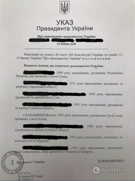 Крім екс-президента Грузії в указі Порошенка сказано про позбавлення громадянства України ще семи осіб.