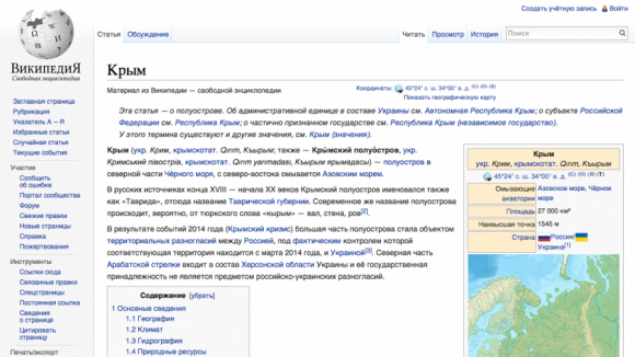 В Государственной думе возмущены тем, что в русском сегменте «Википедии» воссоединение Крыма и Севастополя с Россией трактуется как «аннексия», то есть насильственное присоединение. Депутат от ЛДПР Роман Худяков обратился к главе Федеральной службы по надзору в сфере связи, информационных технологий и массовых коммуникаций Александру Жарову с просьбой внести в черный список запрещенных сайтов статьи в «Википедии», которые распространяют информацию о весенних событиях с прозападной позиции.