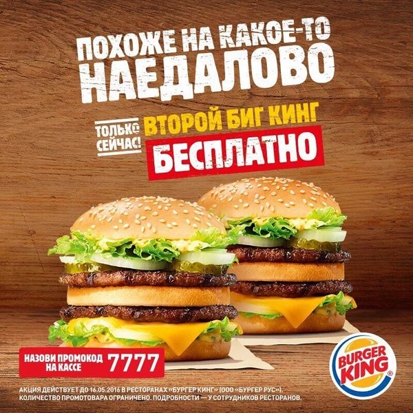 Пользователи Twitter обратили внимание на новый слоган в рекламе сети ресторанов Burger King. Согласно тексту объявления, акция компании, по условиям которой покупатель может получить второй бургер в подарок, похожа «на какое-то наедалово».