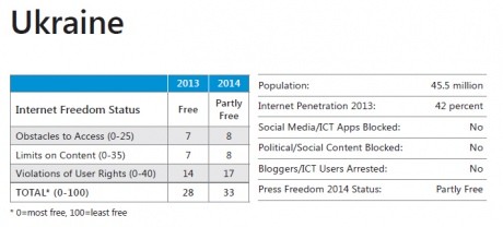 Як кажуть у Freedom House, рейтинг України впав так різко в першу чергу через насильство стосовно користувачів соціальних мереж й інтернет-журналістів під час протестів Євромайдану, зростання числа кібернападів, а також через появу нових даних, які свідчать про значний обсяг стеження влади скиненого президента Віктора Януковича за діяльністю в інтернеті активістів, журналістів і опозиційних діячів.