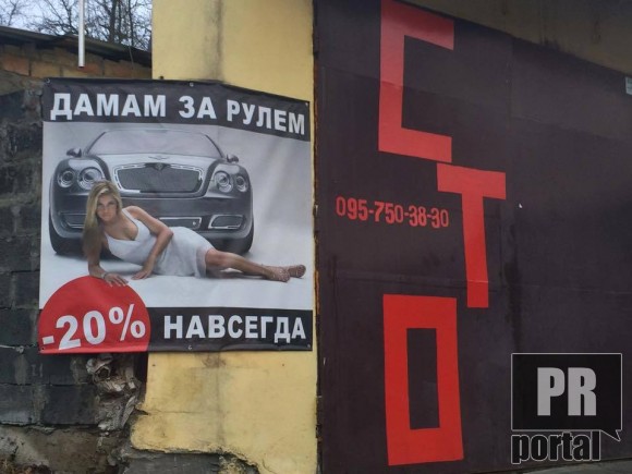 Цікаву акцію запропонувала одна зі СТО столиці. Працівники цієї станції настільки впевнені, що жінки ніколи не навчаться добре їздити за кермом, що пропонують свої послуги з 20% знижкою назавжди. Але найбільше цікавить, чому пропонуючи послуги для дам за кермом піарники зображають жінку перед авто?
