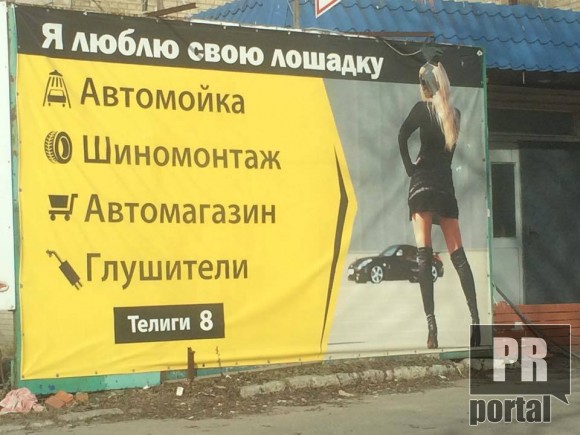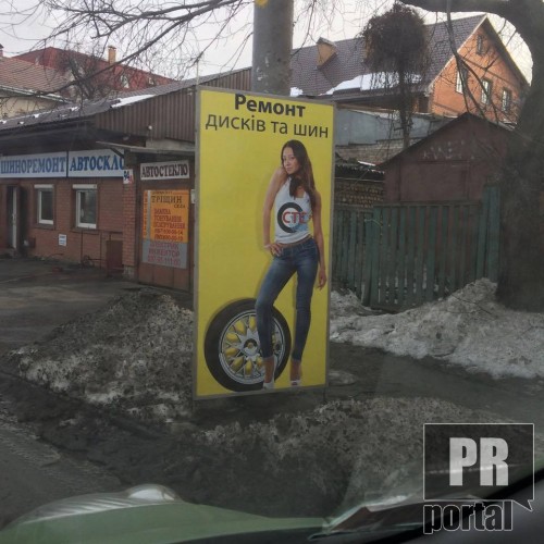На наступній рекламі відремонтувати диски та шини пропонує чомусь не чоловік з брудними руками та спецодягом, а знову ж таки дівчина.
