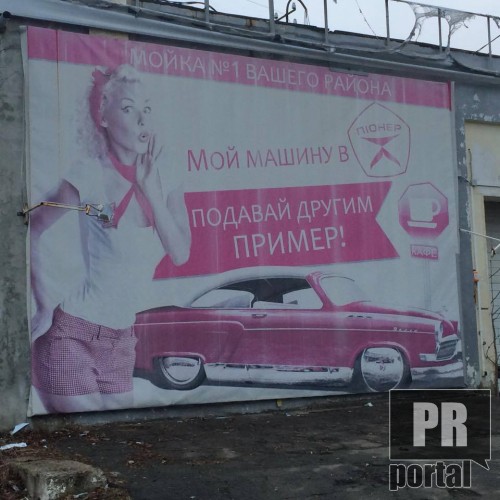 Наступна реклама як ніколи збентежить чоловіків і можливо навіть сподобається жінкам. Тому що такої гламурної реклами автомийки ви ще не бачили. Все в рожевих тонах. Ну просто «мі-мі-мі». І навіть серйозна назва «Піонер» не рятує ситуацію на фоні блондинки в біло-рожевому. Тому милі блонди, яких в свій час не прийняли в піонери, ми знайшли для вас «найгламурнішу» автомийку.