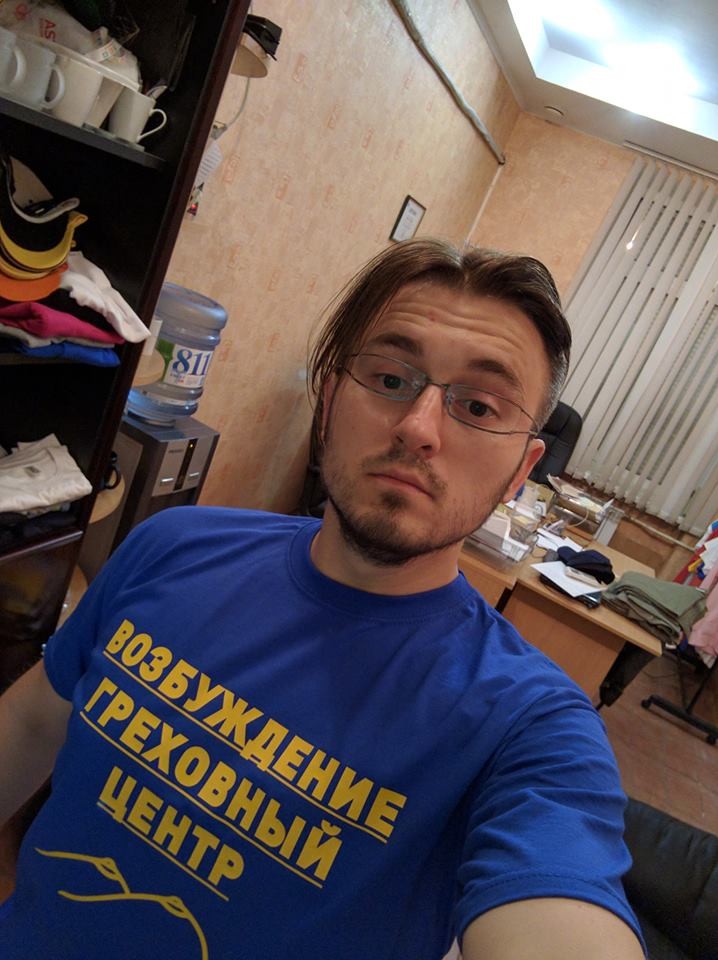 Журналист одет у "фирменную футболку" Центра "Возрождения" но с другим текстом. На ней написано: "возбуждение греховный центр"