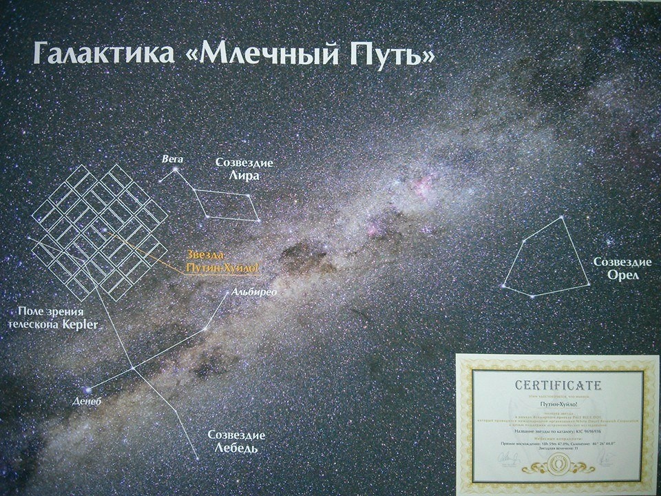 В космосе между созвездиями Лиры и Лебедя официально появилась звезда по имени "Putin-Huilo!". О ее появлении на звездном небе позаботились одесские активисты. В международном каталоге она записана под номером KIC 9696936.