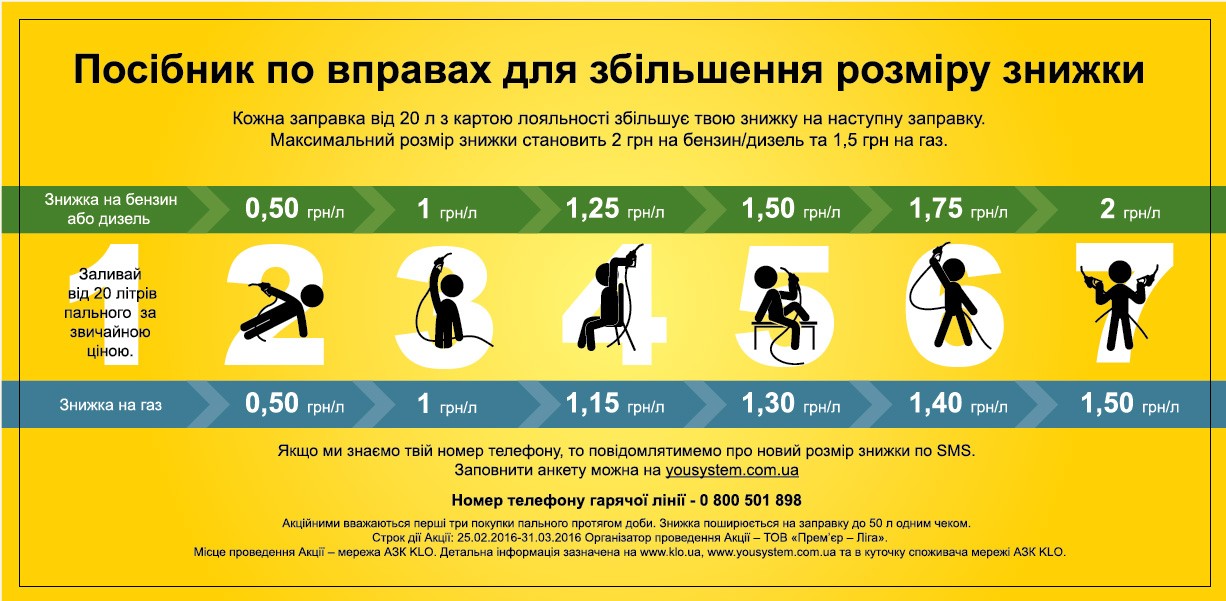 "Качай знижку на пальне до 2 грн./л! Заправляй на KLO 20 літрів та збільшуй знижку з кожною наступною заправкою.Вже друга заправка на 20 літрів обійдеться на 50 коп./л дешевше, на третій ти зекономиш гривню на кожному літрі - і так далі, поки твоя знижка не сягне 2 грн./л!", - повідомляється в умовах акції