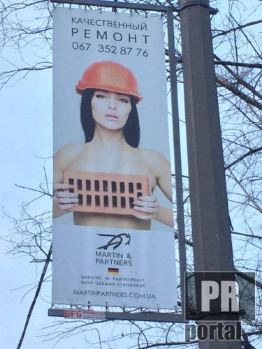 "ШОК! Немцы сделали из украинце рабов! В Украине на стройках работают девушки и им даже не выдают одежду!". Именно такой текст пришел в голову при веде рекламного холдера фирмы "Martin & partners" на котором девушка одетая в каску, прикрывшая грудь кирпичем, рекламирует услухи ремонта по немецкому стандарту.