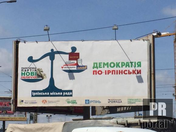 П'ять громадських організацій пояснюють киянам, що таке "демократія по-ірпінськи". На борді зображено ваги на яких одна партія "Нові обличчя" лідером якої є мер Ірпеня Володимир Карпюк, переважую усі інші партії.