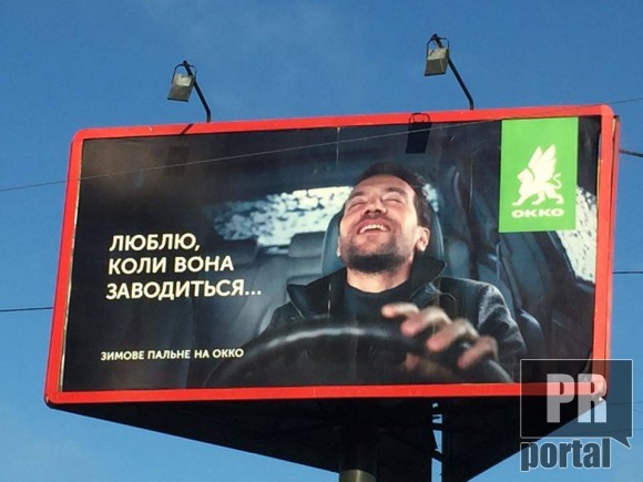Проте, виявляється, що саме з таким задоволеним виразом обличчя водії мають виїзджати з заправок "ОККО" заправившись зимовим пальним. "Люблю коли вона заводиться...", - звучить далеко неоднозначний слоган на борді
