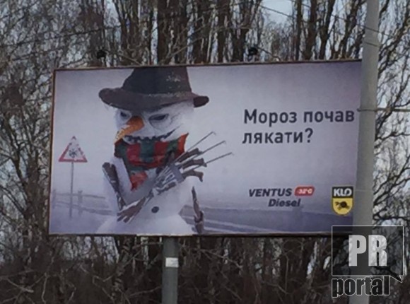 Мережа заправок КЛО вирішила прорекламувати своє зимове дизальне пальне за допомогою жахливого сніговика, котрий схожий на Фреді Крюгера. В тему і запитання на борді: "Мороз почав лякати?"