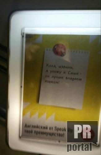 "Коля, извини, я ухожу к Саше - он лучше владеет языком". Таким слоганом SpeakUp рекламує курси англійської мови. Фото такої реклами фотокор PRпортал зафіксував у київському метрополітені.