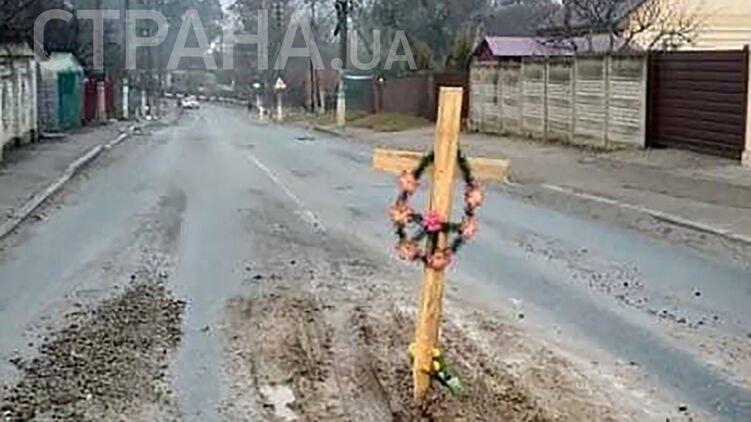 У селищі Немішаєве в дорожній ямі встановили хрест з вінком