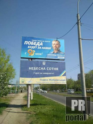 Боротьба символів та цінностей відбулася у Маріуполі. Як повідомляє PRпортал, під бордом з якого нардеп від Орозиційного блоку Олександр Вілкул, вітаючи з 9 травня, яке в Росії святкують як День перемоги, досить прозоро натякнув: "Танки грязи не боятся. Победа будет за нами". Такі борди зявилися у прифронтовому Маріуполі. У відповідь, голова Донецької військово-цивільної аміністрації Павло Жебрівський повісив борд-відповідь зі слоганом: "Небесна сотня. Герої не вмирають!"