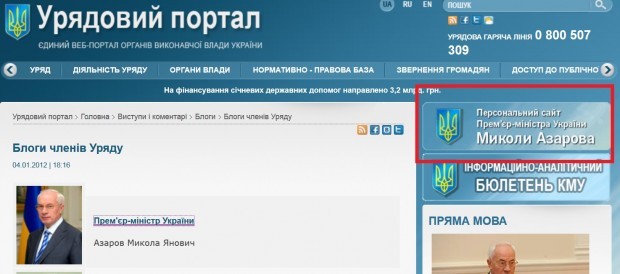 І все б нічого, але хтось вирішив, що приватний сайт громадянина Азарова можна рекламувати на одному з найкращих місць на сайті уряду, який фінансується з державного бюджету. Чому саме його і чим він заслужив таке почесне місце – не зрозуміло.
