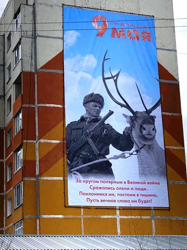 У російському місті Усинськ в Республіці Комі напередодні Дня перемоги на стіну будинку вивісили святковий банер з оленем і озброєним фінським солдатом. На помилку вказали блогери, і банер місцева влада поспішила зняти, пишуть російські ЗМІ.