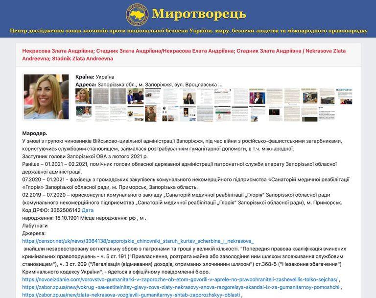 Слід сказати, що через декілька днів після публікації НАБУ новини про обшуки на Запоріжжі, ці високопосадовці, зокрема Некрасова, з'явились у базі сайту "Миротворець". Напроти чиновниці видніється слово "мародер".