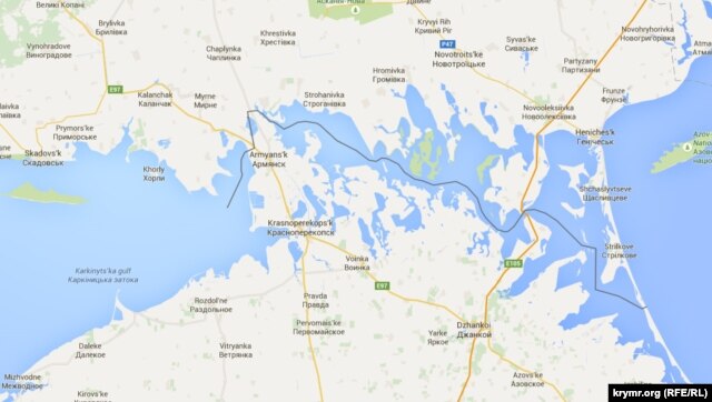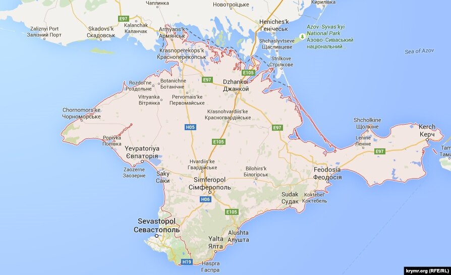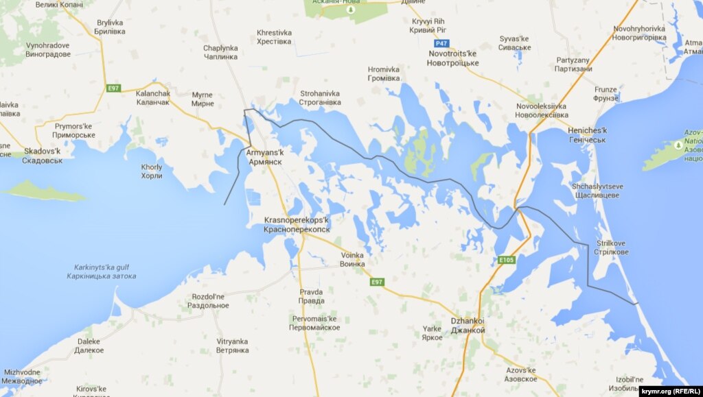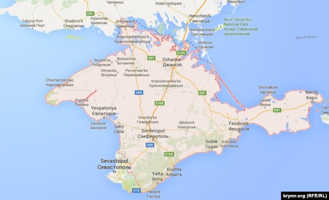 Впрочем, GoogleMaps и GoogleEarth все же несколько изменили образ, которым обозначается линия стыка материковой Украины и Крыма. Русская версия GoogleMaps, например, рисует ее черным цветом, как настоящую демаркационную границу между государством и аннексированным Крымом.