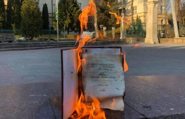 Про це Ябчанка написав увечері 26 квітня у ФБ, ілюструючи свій вчинок фотографією палаючого диплома перед Львівським медуніверситетом, де він захистив свою дисертацію.
