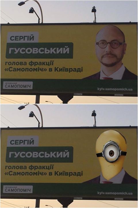 Користувачі соцмереж познущались з політичної реклами кандидата від "Самопомочі" Сергія Гусовського, порівнявши з відомим персонажем мультфільму "Посіпаки"