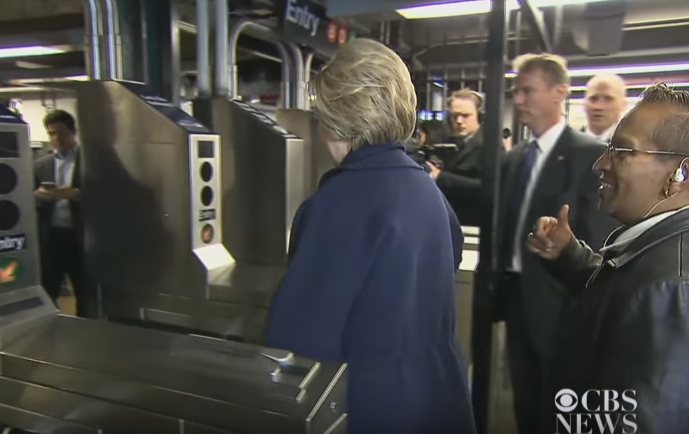 Претендент на пост президента США от демократов Хиллари Клинтон в четверг, 7 апреля, находясь на встрече с избирателями в Нью-Йорке, решила спуститься в метро. Как сообщает Politico, при входе в подземку бывший госсекретарь столкнулась с трудностями: через турникет она смогла пройти только с пятого раза.