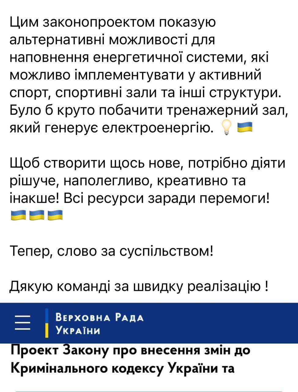 У пояснювальній записці до законопроєкту йдеться, що установи відбування покарань мають виконувати не лише пряму функцію, а й сприяти виправленню та ресоціалізації засуджених. А важливим елементом у цьому є виконання суспільно корисної діяльності, яка може бути у різних формах. Другий аргумент нардепа – заняття спортом та інша активна фізично-оздоровча діяльність засуджених є «бажаною, корисною і навіть необхідною для їхнього здоров'я».