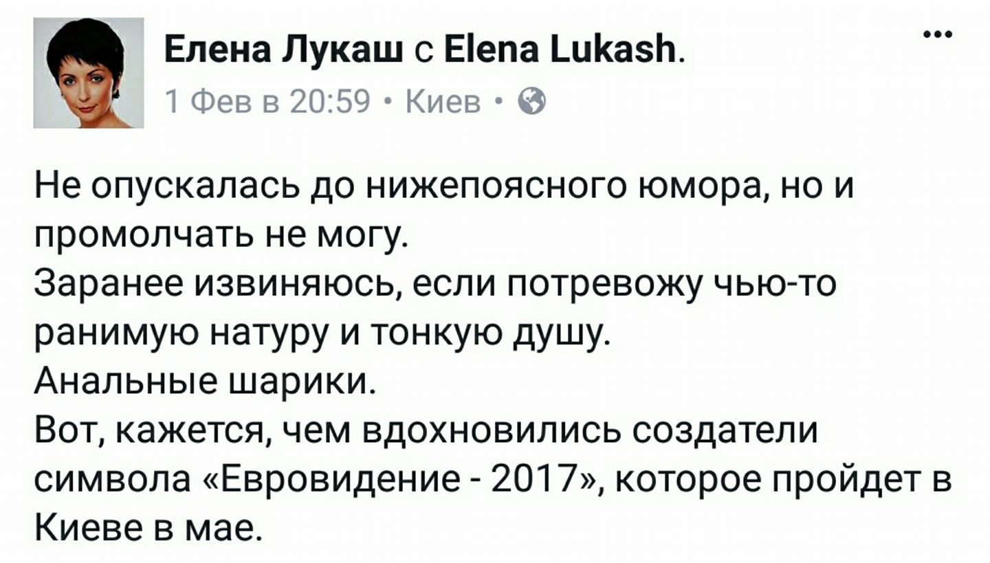 Екс-нардеп от Партии Регионов Елена Лукаш назвала логотип Евровидения - анальными шариками. Об этом она написал у себя на Фейсбук