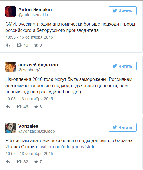 Після цього від блогерів і користувачів соцмереж відразу ж посипалися їдкі коментарі — кожен пропонував, що жителям Росії може підійти "з точки зору анатомії".