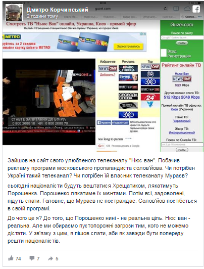 "Зашел на сайт своего любимого телеканала "Нюс ван". Увидел рекламу программы московского пропагандиста соловьева. Нужен ли Украине такой телеканал? Нужен ли ей владелец телеканала Мураев?" – говорится в сообщении, к которому автор прикрепил скриншот со страницы сайта guzei.com для онлайн просмотра телепередач.