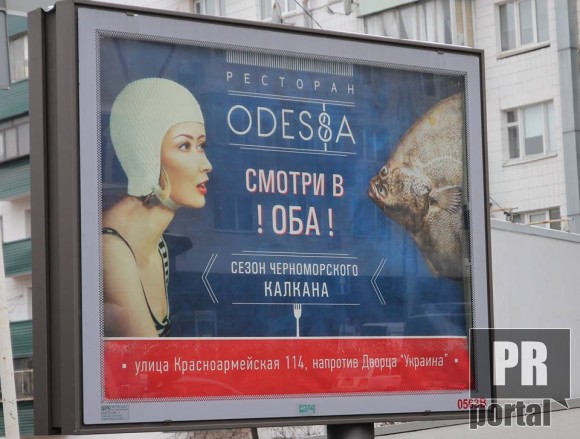 Київський ресторан вирішив продемонструвати креатив і розмістив рекламу з написом "смотри в оба". На рекламі дівчина, з непритаманним розсташуванням очей дивилася на рибу. Але стрілки з написом "сезон чорноморського калкана" вказували нгапрямок руху на ліво. З такою косоокою рекламою клієнту дійсно потрібно дивитися "в оба".