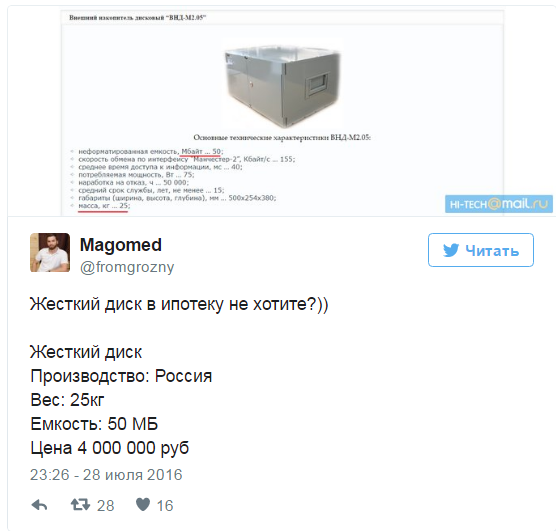 Соцсети высмеяли российский жесткий диск на 50 мегабайт весом 25 килограммов