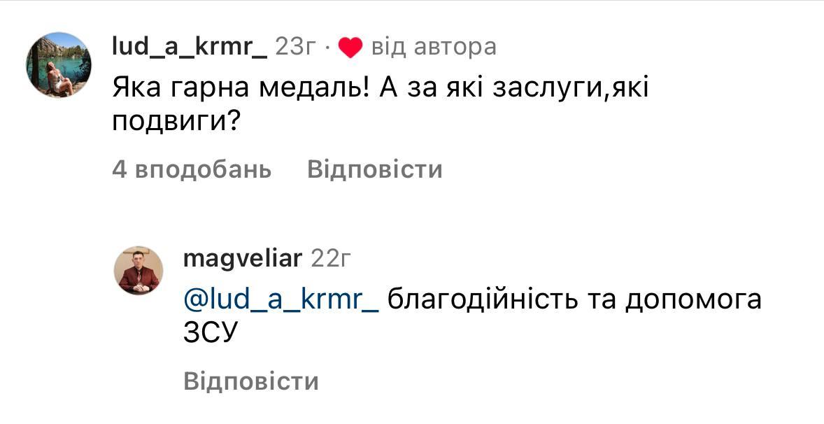 Фото відзнаки Маг Веліар опублікував у соцмережах. У коментарях Веліар зазначив, що орден отримав за благодійність та за допомогу ЗСУ.