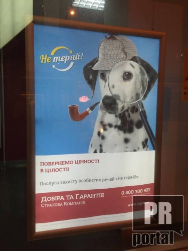 Страхова компанія для реклами нової послуги "не теряй" обрала обличчям акції собаку, з якого намагались зробити "Шерлока". Як можна помітити, незрозуміло чим собака тримає лупу та як курить люлюку , якщо вона намальована майже біля щоки.