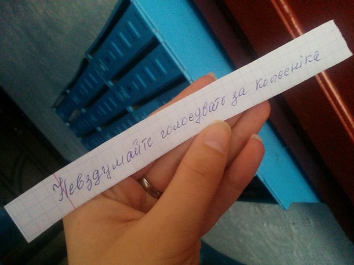 На малесенькому клаптику паперу суржиком( голосувать) та з помилкою в першому слові ( не вздумайте) невідомі просять не голосувати за кандидата від Опозиційного блоку - Колесніка.