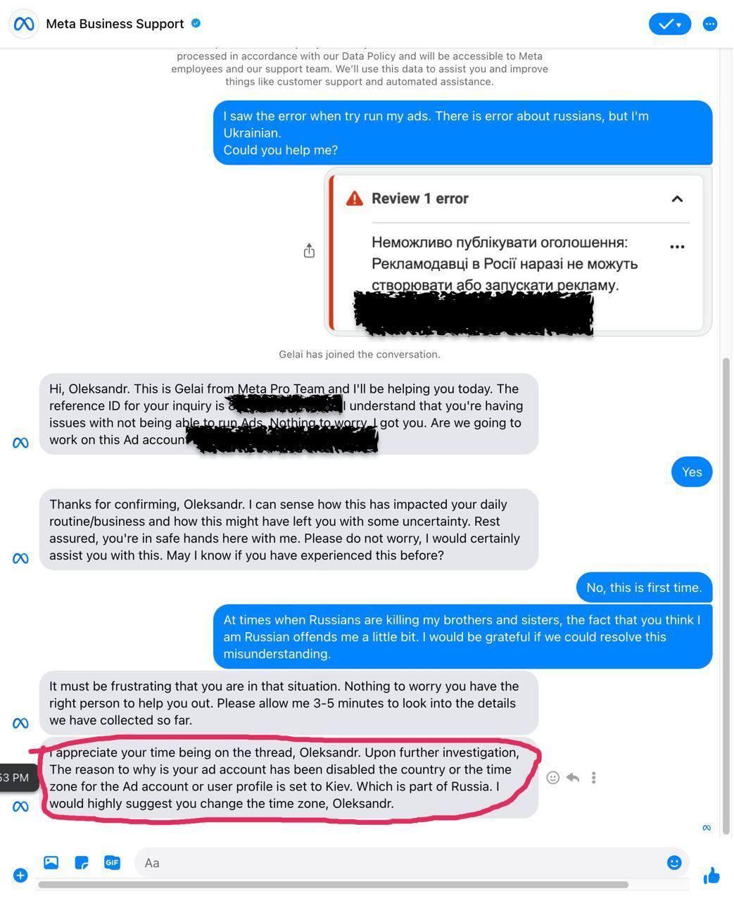Листування з працівником підтримки оприлюднив користувач Фейсбуку Святослав Степаненко. Він написав у підтримку, бо не зміг опублікувати оголошення. Йому вибила помилка через те, що рекламодавці у рф не можуть створювати або запускати рекламу, а чоловік, мовляв, перебуває у росії.