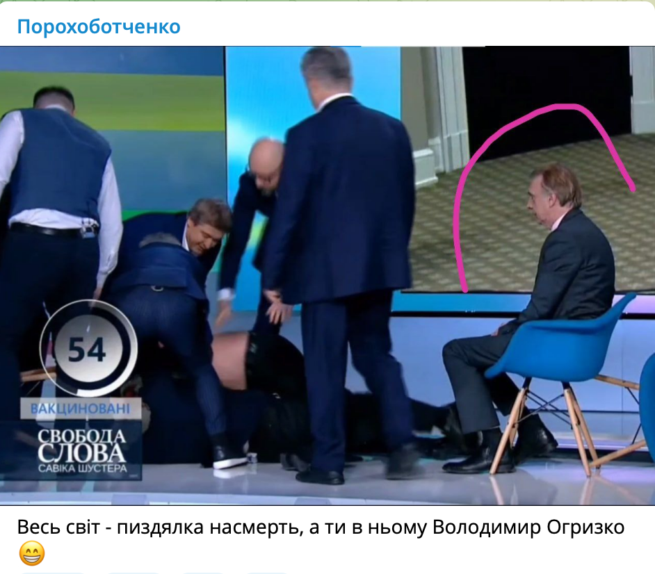 Чоловіків втихомирювали близько п'яти осіб: експрезидент Порошенко, експрем'єр Яценюк, ексглава МЗС Огризко, екскомандир полку "Азов" Білецький, екссекретар РНБО Данилюк, ведучий Савік Шустер.