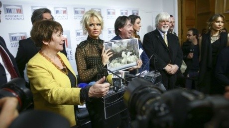 Памела Андерсон принимает участие в кампании против насильственного кормления уток и гусей для получения фуа-гра, хотя большинство членов французского парламента и против такого запрета.